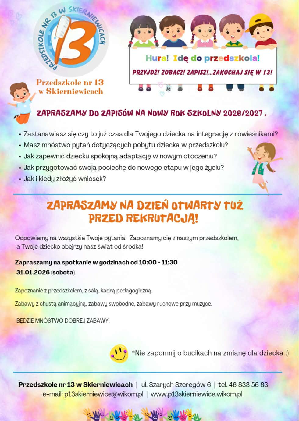 Postępowanie rekrutacyjne na rok szkolny 2026/2027 prowadzone jest z wykorzystaniem systemu informatycznego. Rodzice/opiekunowie prawni kandydata korzystają ze strony rekrutacyjnej do przedszkola http://www.skierniewice.przedszkola.vnabor.pl